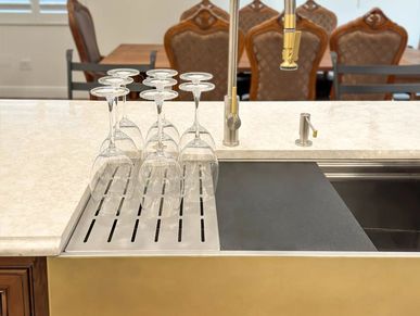 The Culinary Dock™, seamlessly integrated into your custom Rachiele® sink, offers a discreet yet easily accessible home for your multi-use grid or butcher-grade cutting board. Thoughtfully designed for the discerning cook, this concealed docking station elevates your daily workflow—keeping tools upright, dry, and precisely where you need them, while preserving the clean, uninterrupted beauty of your kitchen.