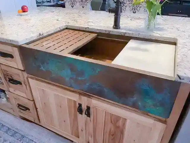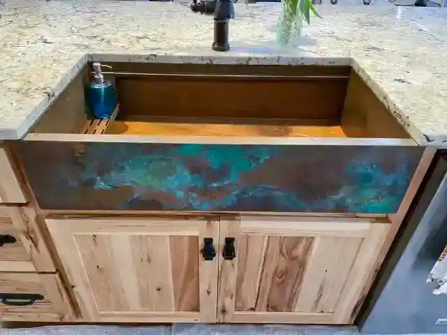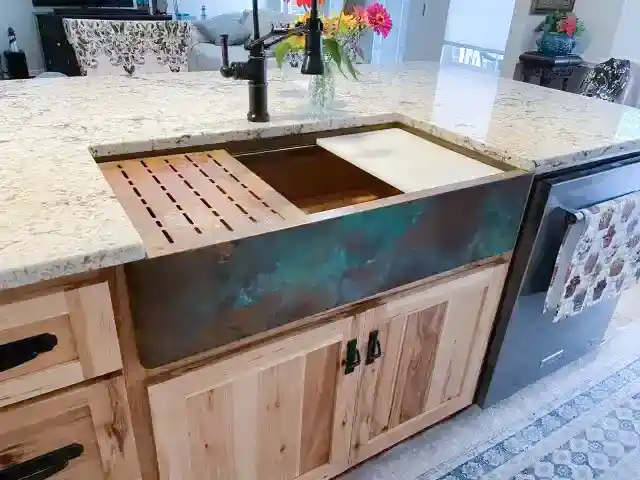 "I could never justify money for a custom piece for my home, but when it came to the sink, I figured I ‘d get my daily use out of it. Well, now, 5 years later, I can say this sink is hands down the best investment in my home. I feel like it’s the heart of our home. Everything happens at the kitchen sink. It welcomes us when we come home because we wash our hands as soon as we walk in. It greets us in the morning as we make our first cup of coffee. It is there when we prepare our meals, and when we clean up. All our family somehow gathers around it at holiday get togethers. And it seems to “speak” to my guests with its ever changing patina colors. I don’t regret one bit having splurged on this. We are a military family, so yes, it was a big investment for us, and it was so wise to have splurged on the sink of all things, because it’s the most used thing in this entire home. It’s very well made, craftmanship that I’m familiar with, being from Italy. It has a unique design on the front that the artist worked with me to create. And best of all, it is so functional. Sometimes I leave the cutting board in the rail, sometimes the drain tray, sometimes just the sponge caddy. I can give my kitchen a fresh feeling every month just because of how customizable it is with all the accessories. Oh, and by the way, do yourself a favor and also get a USA made faucet, 5 years in and not one issue. Thanks Dino for being so passionate about what you guys make there!" See review here.